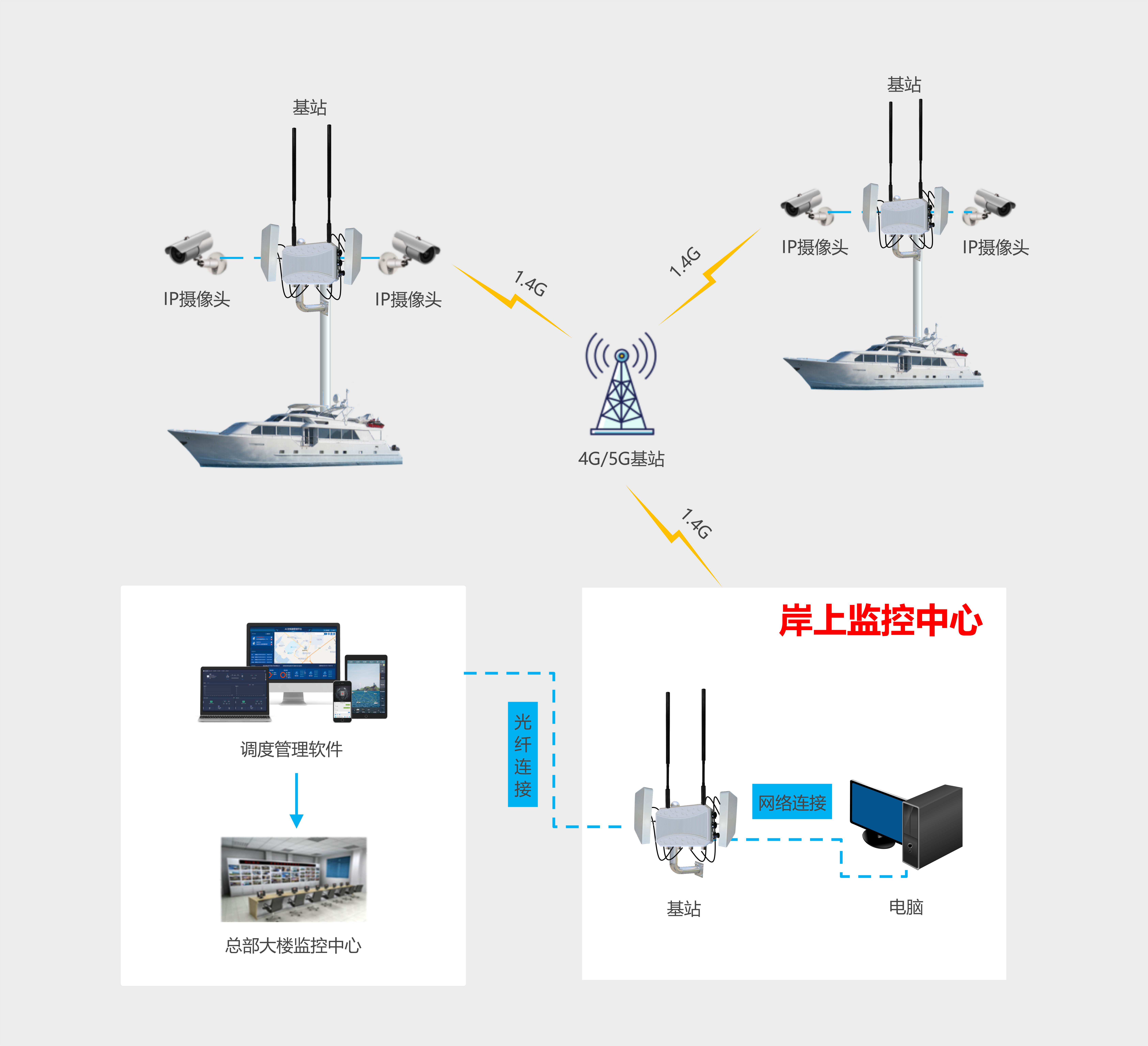常用于海上船舶无线传输系统的一般分为两种,一是采用3G/4G的无线视频监控系统,另一个就是采用数字无线传输设备进行定向传输的无线传输系统。